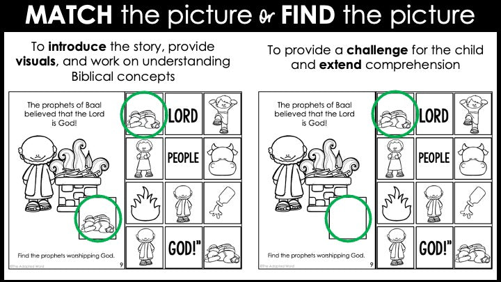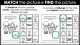 - Two options for each Bible story. Children can match or find the pictures. The matching version is good for introducing the story and for children who needs visuals. Finding the picture is more of a challenge and works well with children who are familiar with the story.