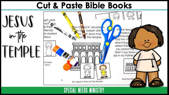 Made for special needs ministry, Cut & Paste Bible Books – Jesus in The Temple – are designed for children with special needs, particularly children with language disorders.