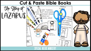 Made for special needs ministry, Cut & Paste Bible Books – Lazarus – are designed for children with special needs, particularly children with language disorders.