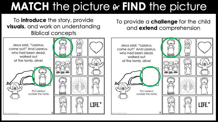 - Two options for each Bible story. Children can match or find the pictures. The matching version is good for introducing the story and for children who needs visuals. Finding the picture is more of a challenge and works well with children who are familiar with the story.