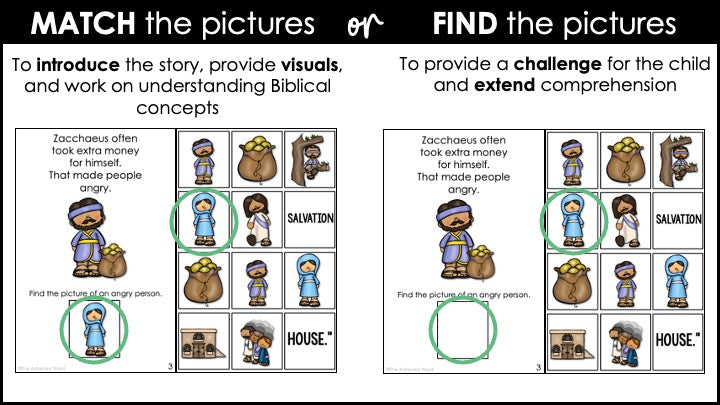 - Two ways to present the Bible story. Children can match or find the pictures. The matching version is good for introducing the story and for children who needs visuals. Finding the picture is more of a challenge and works well with children who are familiar with the story.